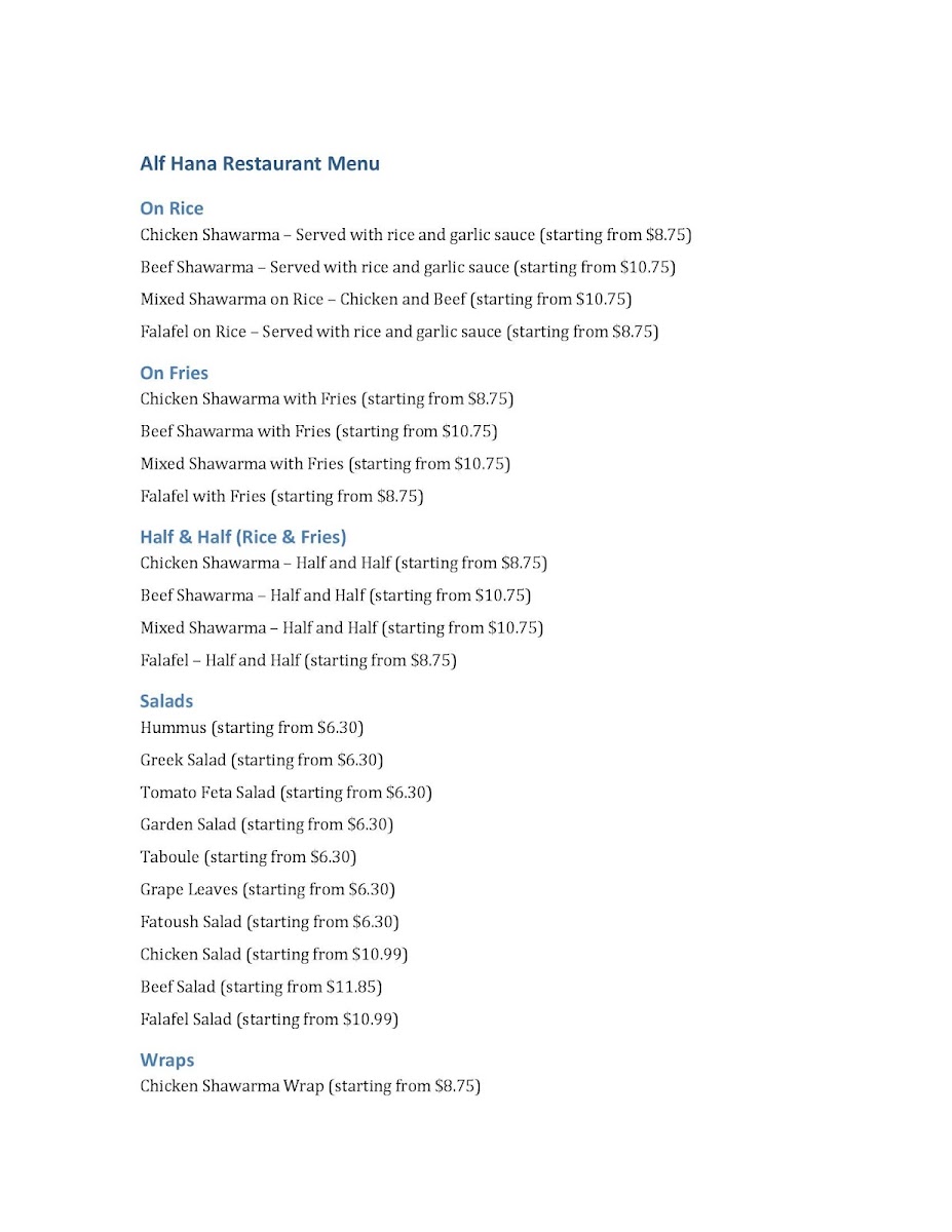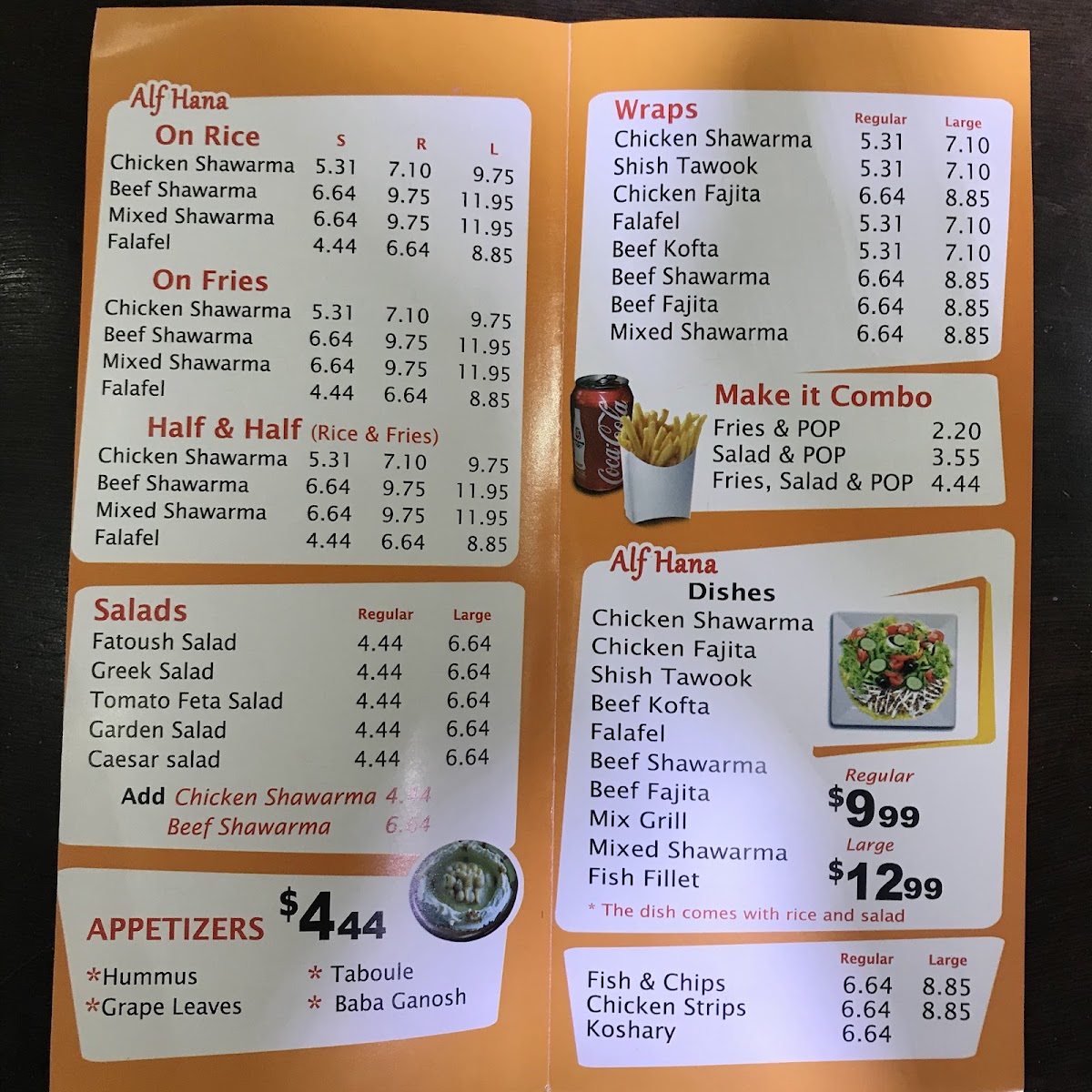 Welcome to Alf Hana Shawarma Hut, a delightful culinary gem located in Mississauga, Canada. This vibrant eatery specializes in mouthwatering shawarma and other delectable dishes that capture the heart and palate. Customers rave about the hearty portions and exceptional taste; many, like Sanaa Eltwekhy, have enjoyed the "half and half" option, appreciating both the flavor and affordability.